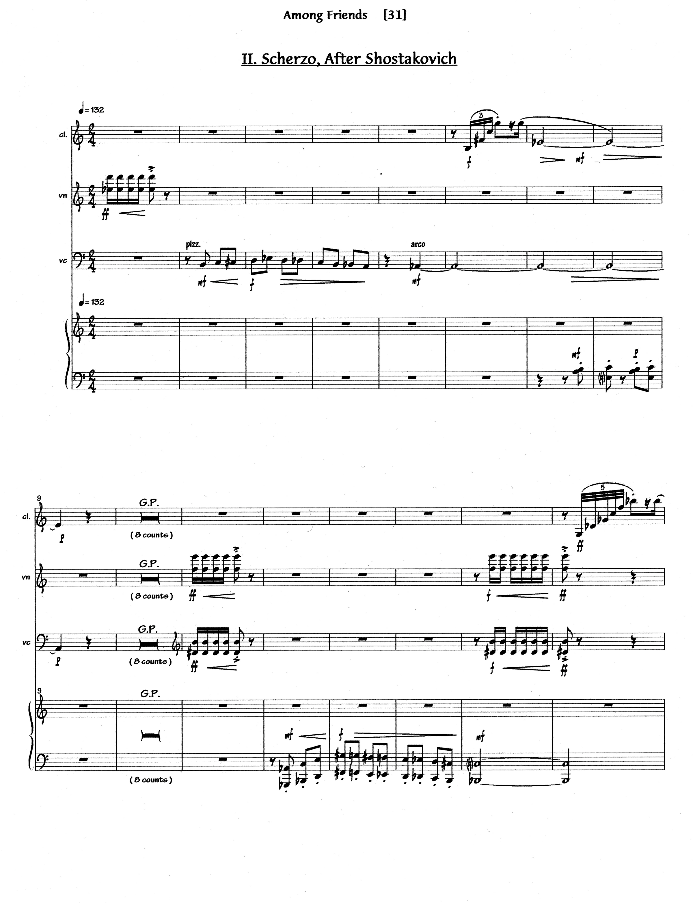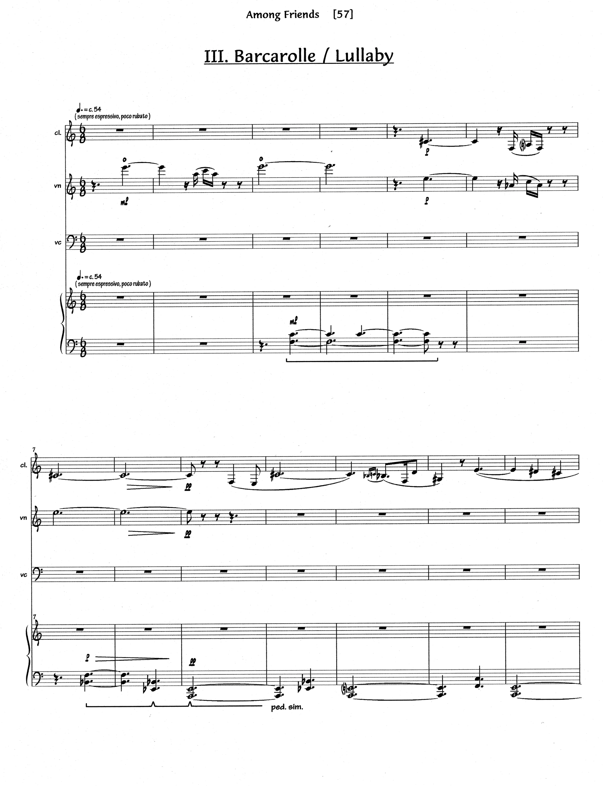 While looking for ideas for Among Friends, I happened to hear a performance of a piano sonata by Alfred Schnittke. I had admired Schnittke’s Concerto for Choir and was hoping for something equally moving in the piano sonata, but nothing really touched me until I heard a brief reference to Shostakovich. I began to imagine what I wished Schnittke had written, and that is how the first movement begins, with slow, somber low notes. Gradually the tempo increases, and a ghostly little waltz is heard, as well as a vaguely Arabic melody in the clarinet, Shostakovich’s musical signature (D/Eb/C/B), and a fugue that eventually goes out of control. The second movement is a scherzo in all but its meter, which is in two rather than three. Its unrelenting cascade of musical ideas is an ironic comment on the frenetic pace of contemporary life; scrubbing strings, the Woody Woodpecker motive, and fragments of two folk tunes add to its humorous character. After such frantic activity, the quartet ends with a slow “Barcarolle/Lullaby,” in which references from the previous movements are combined in an homage to two other favorite composers, Paul Hindemith and Dominick Argento. Among Friendswas commissioned by the Music in the Park Series for their 25th anniversary, and premiered May 9, 2004, at the St. Anthony Park United Church of Christ, St. Paul, MN, by Steven Copes, violin; Anthony Ross, cello; Burt Hara, clarinet; and Pedja Muzijevic, piano.